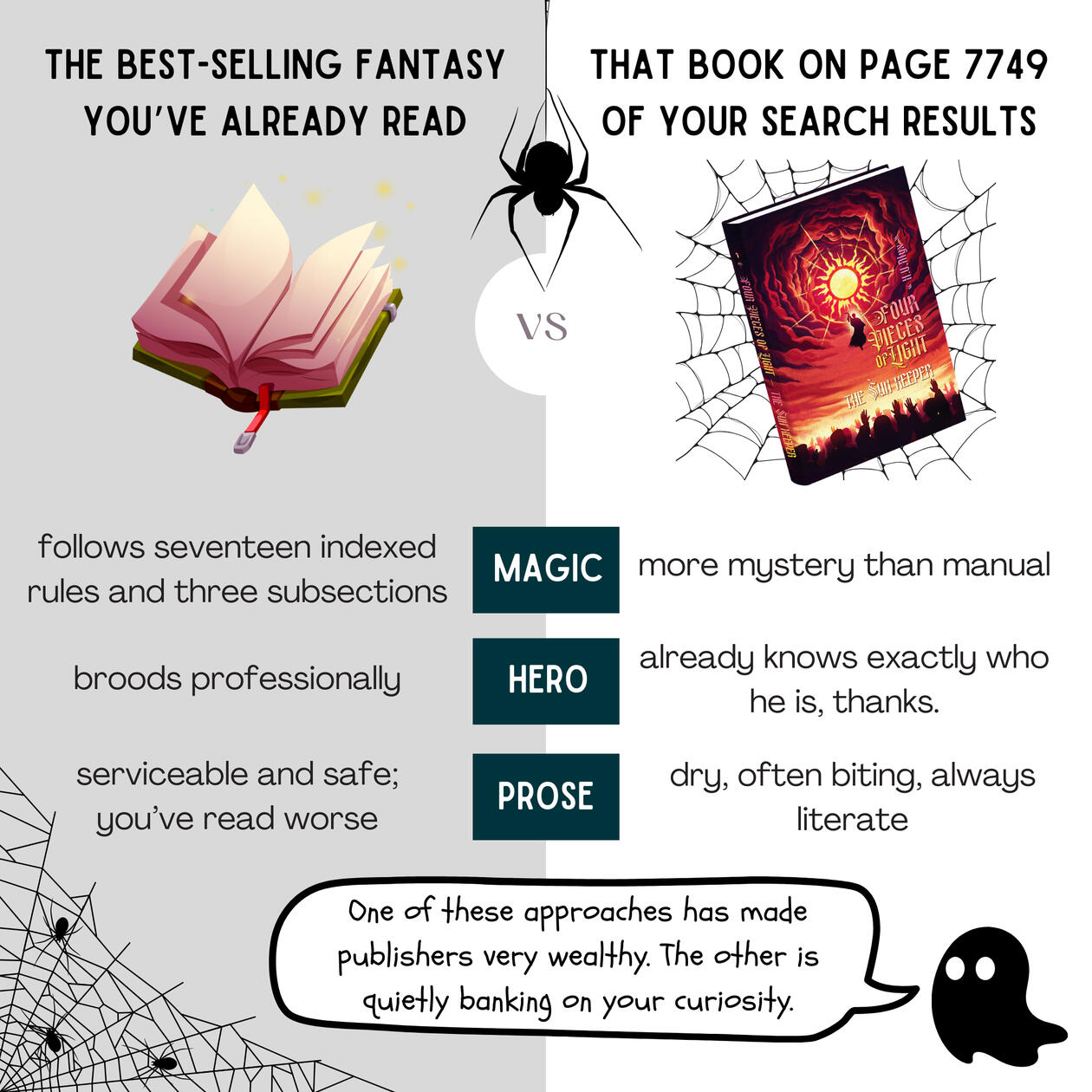 I have 500 bestsellers languishing unread on my shelves. Why should I give you a chance?Entirely fair. But if you’ve found your way here, it might mean you’re not looking for another bestseller. You might be looking for something a little more honest, or a little less algorithmically optimized. What you see on this page is what the series is. There’s a sample chapter below. If it doesn’t speak to you, you’ll have wasted five minutes you weren’t using to read War and Peace anyway. But if it does… well, wouldn’t that be something?I bought an unfinished series in 2011. It never ended. I now have a mortgage, two kids, five dogs, and a philosophical fatigue. Why should I trust you?First of all: condolences. Second of all: I’ve invented this radical new technique for finishing a series. It’s called actually writing the rest of it.Yes, the series has an actual end, and I’m writing my way there. You just have to trust me.Is there a map?No. If you get lost, that’s part of the experience. The characters aren’t always sure where they are either.Will there be romance?The spider is quite fond of the beast (off-page), if that counts.